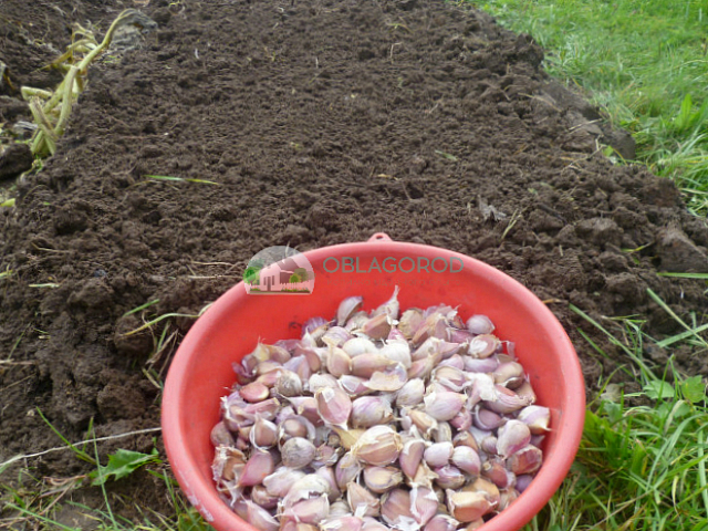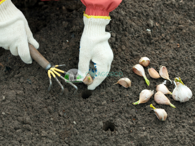 При розміщенні в грунті озимої культури особливо важливо дотримуватися рекомендацій про те, як посадити часник. Як і у випадку з ярим часником садити необхідно на відстані 20-25 сантиметрів, таку відстань полегшить прополку, полив, розпушування та інші необхідні процедури по догляду. Садити рекомендується глибше, в порівнянні з ярим овочем, приблизно на глибину 15-20 сантиметрів. Часто посадка часнику на зиму ускладнюється такою проблемою, як загнивання донця. Для того, щоб її уникнути, необхідно на дно борозенки насипати золи або піску. Матеріал буде вбирати зайву рідину і допоможе запобігти перепревания часниковий головок в землі під час росту посівів.