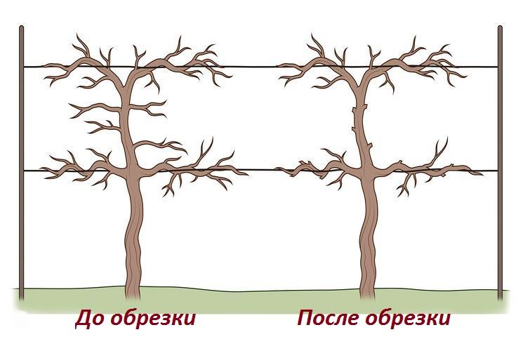 На всіх пагонах, оформились з нижніх нирок восени 3-го року, залишається 2-3 очка, а на верхніх, які виросли з них, – 5-6 очок. На чотирирічному втечу (самому нижньому, що утворився з верхніх нирок) залишають 10-12 очок. Так оформляється кордон з короткою і довгою обрізанням плодових стрілок. Всі пагони навесні на четвертий рік підв'язують похило до першої дроті шпалери. Причому найбільший нахил задають побіжу «А».