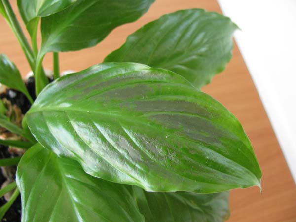 В результаті опіку кореневої системи добривами великі темні плями з'являються на листках спатифиллума дуже швидко. Потім листя набувають жовте забарвлення і відмирають. Щоб виправити цю ситуацію, досить промити кореневу систему рослини в чистій і теплій відстояною воді, а потім здійснити пересаджування в чистий грунтовий субстрат.