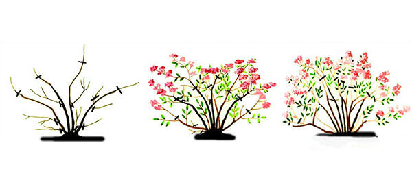 Кущові культури мають властивість розростатися, що передбачає проведення систематичної обрізки. Раноцветущіе молоді рослини вимагають щорічної обрізки тільки при вимерзання пагонів. У більш дорослих кущів видаленню підлягають всі старі пагони, що дозволить рослині сформувати новий продуктивний кущ. Через пару років після посадки необхідно видалити всі ослаблені і старі пагони. Санітарна обрізка здійснюється у весняний період або влітку.