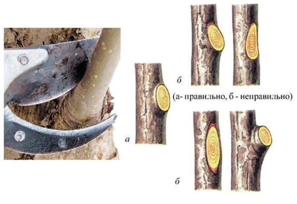 - якщо виросли неправильні гілки – ростуть усередину крони, до землі, переплетені, то їх видаляють. Гілка обрізають «на кільце», тобто без пенька. Місце зрізу замазують садовим варом, оскільки при неправильній обрізці на місці зрізу може з часом утворитися дупло, дерево подгніёт, захворіє і може загинути;