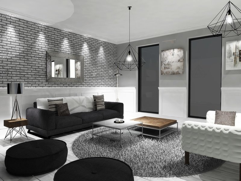 - Колірна гамма переважно монохромна: сіра, біла, беж, попелястий, пісочний і т.д. Щоб привнести якесь розмаїття в інтер'єр, використовують півтони. В обробці допускаються і темні кольори: чорний, коричневий і т.д. з метою підкреслити загальну стилістику. Наприклад, вельми популярний варіант – чорно-біла вітальня;