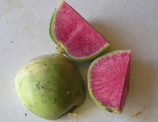 Найбільш корисними вважаються види, у яких червона м'якоть. Сам коренеплід при цьому все одно зверху буде зеленим або майже білим. У таких овочах міститься величезна кількість мінеральних солей, клітковини і цукрів. Даний вид приємний на смак. Його їдять у свіжому вигляді, маринують, додають в салати і використовують в складі інших страв.