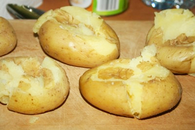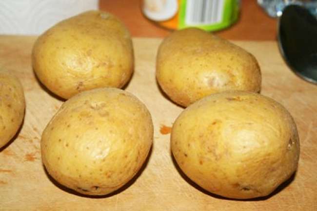 По суті – це картопля в мундирі в духовці, тому спочатку гарненько вимийте картоплю у воді і поставте їх варити. Як зваряться, відкладіть їх в сторону, щоб вони охололи.