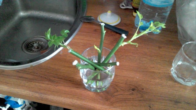 До посадки живці поставте в воду або загорніть у вологу газету. Як стимулятор коренеутворення можна використовувати розчин меду (1 ч.л. на склянку води) або Корневином (по інструкції). Нижній кінець держака опустіть до складу на глибину 2-3 см на 12-15 годин. Намагайтеся не намочити листя.