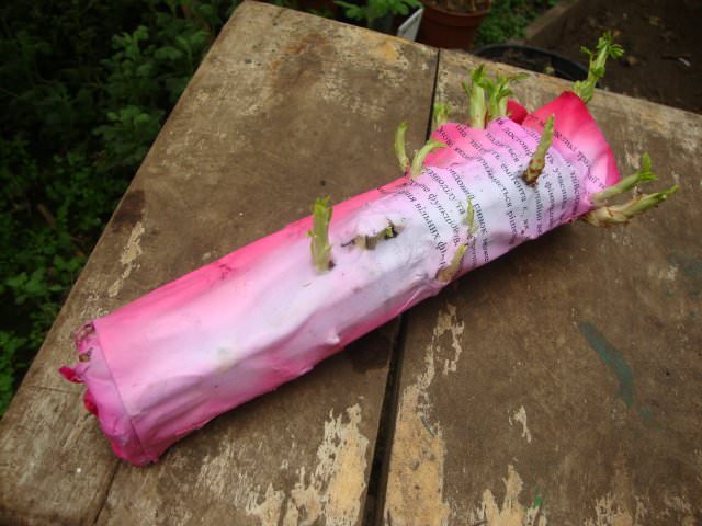 Спосіб живцювання в газеті за методом Буріто не дуже затребуваний у вітчизняних квітникарів, але дуже простий. Нижню частину нарізаних черешків слід обробити стимулятором «Корневин» або «Епін», після чого загорнути в зволожену газету і розмістити на пару тижнів в темному місці при дотриманні температурного режиму на рівні 15-18ºС до появи коренів.