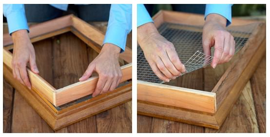 - Покласти раму лицьовою стороною вниз, натягнути по її периметру сітку, зайві її частини відрізати кусачками;