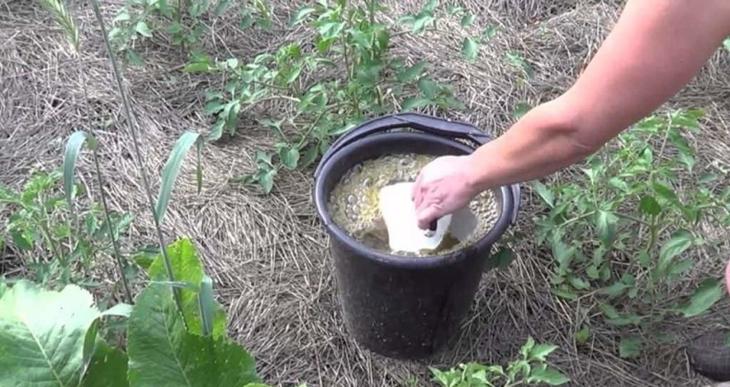 - Відро об'ємом 8 л наповнюють наполовину шматочками сухого чорного хліба, заповнюють водою, щоб сухарі вкрилися нею, зверху кладуть тарілку такого розміру, щоб вона не давала шматочках спливти, і ставлять на неї вантаж, наприклад, трилітрову банку з водою. Через тиждень майбутнє добриво проціджують, додають 3 л чистої води.